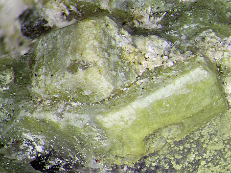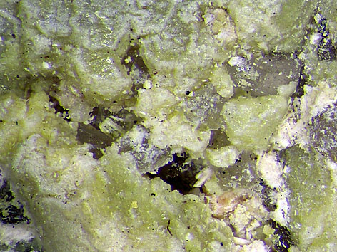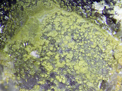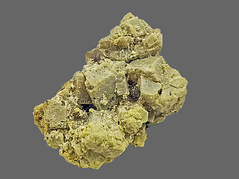 monoklines Kristallsystem; grünlichgelb, gelb; equante, komplex facettierte Kristalle, Beschichtungen, Krusten, Adern.