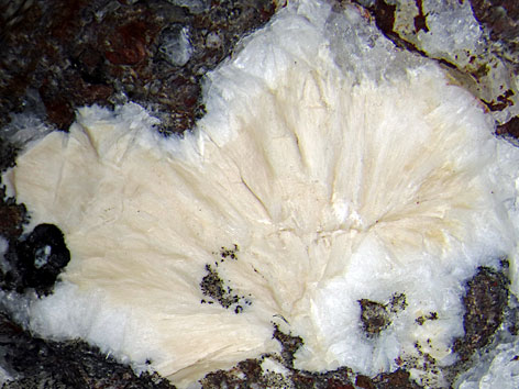 tetragonales Kristallsystem; farblos, weiß. Garronit-Ca bildet strahlige Aggregate bis etwa 2 cm Größe, die Hohlräume im Gestein füllen. Selten sind dipyramidale, undeutliche Kristalle. |