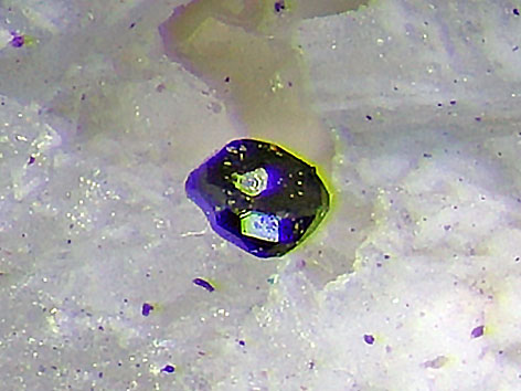 Geikielith-Kristall auf Marmor Detail der links abgebildeten StufeBildbreite: 1,2 mm