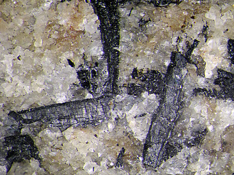 triklines Kristallsystem; schwarz; pseudomonokline, längliche, poikiloblastische Kristalle bis 4 cm Größe, selten in strahlenförmigen Gruppen. |