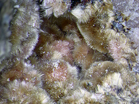 monoklines (mineralienatlas.de) / orthorhombisches (mindat.org) Kristallsystem; gold- bis bronzefarben, bräunlich, rosa, lavendelfarben; nadelige Kristalle bis 2 mm Länge, radialstrahlige Aggregate. |