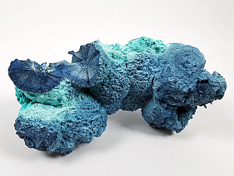 orthorhombisches Kristallsystem; grün, blau bis dunkelblau; längliche prismatische Kristalle, überwiegend feinnadelige bis faserige Kristalle in radialstrahligen, traubigen oder massigen Aggregaten.