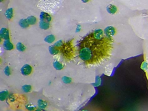 Agardit-(Ce), grünlichgelbe, nadelige xx (Igel) neben Cornwallit xx (grün) auf Quarz Grube Clara, Oberwolfach, Schwarzwald, Baden-Württemberg, BRD (TL) Bildbreite: 1,5 mm