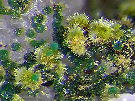 ![]() Agardit-(Ce), grünlichgelbe, nadelige xx (Igel) neben Cornwallit xx (grün) auf Quarz Grube Clara, Oberwolfach, Schwarzwald, Baden-Württemberg, BRD (TL) Bildbreite: 1,5 mm