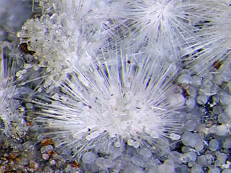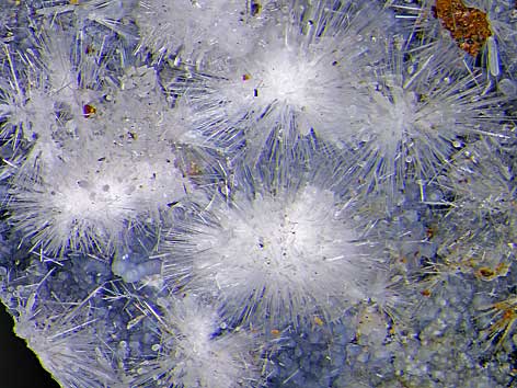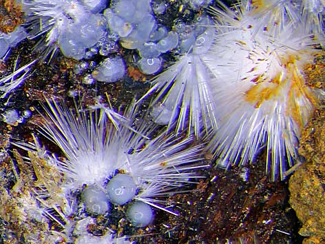 nadelige Canavesit xx neben weißen Dypingit-Kugeln und farblosen, transparenten Inderit xx Miniera die Brosso, Càlea, Canavese, Turin, Piemont, Italien (TL) Stufe: 9 x 6 cm