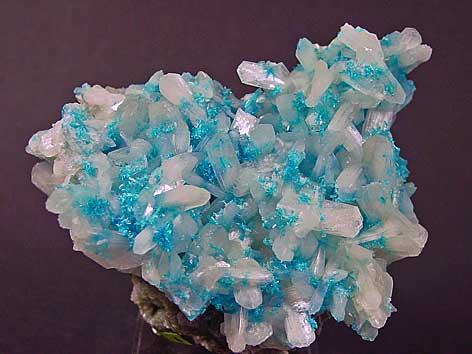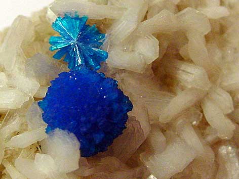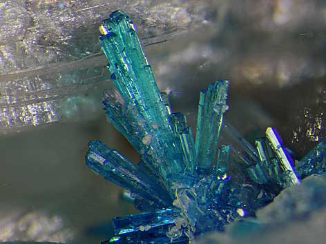 orthorhombisches Kristallsystem; Dimorph von Pentagonit; grünlich- bis tiefblau; länglich-tafelige, prismatische oder nadelige Kristalle, radialstrahlige Aggregate und Rosetten |