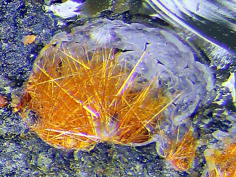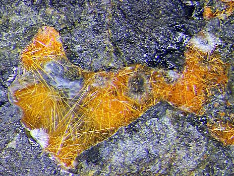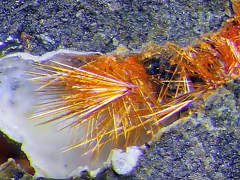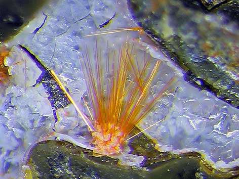 hexagonales Kristallsystem; oft orange, violett-braun bis purpurrot; Kristallnadeln mit einer Länge von bis zu 3 mm, oft auch als Kristallbüschel. |