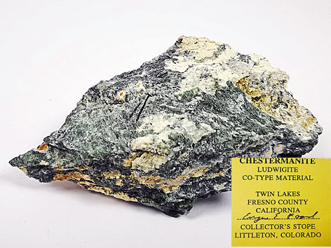 IMA 1986-058; 1988 - R. C. Erd & E. E. Foord. Das Mineral wurde benannt zu Ehren von Charles Wesley Chesterman (1913 - 1991), Geologe und Mineraloge, California Division of Mines and Geology, San Francisco, USA, der die ersten Exemplare entdeckt (Erstfinder). |