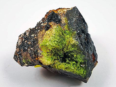 tetragonales Kristallsystem; gelblichgrün, smaragd-, pistazien- oder olivgrün, braun; nur kleine, dipyramidale Kristalle, meist mikrokristalline Aggregate aus botryoiden Kügelchen, Verkrustungen und als Adern, ebenso kompakt bis brüchig massiv. |