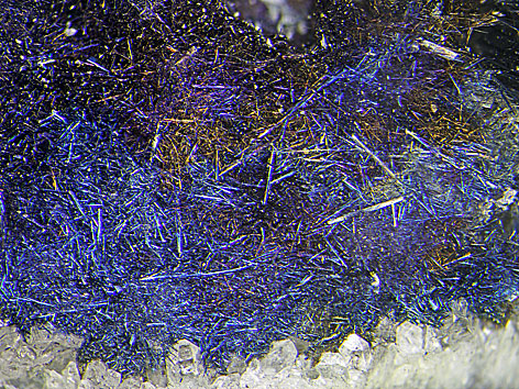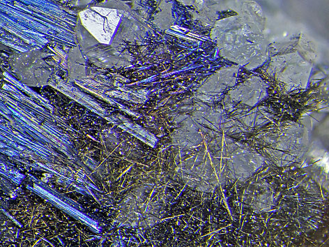 triklines Kristallsystem; blei- bis stahlgrau; kleine faserige bis nadelige Kristalle bis etwa 2 mm Länge mit parallel der Längsachse gestreiften Flächen, die zu „stahlwolleförmigen“ Aggregaten angeordnet sein können |