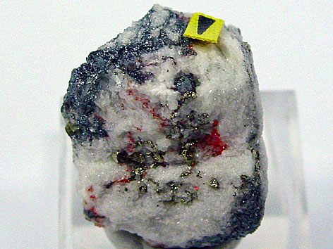 Edenharterit xx auf Hutchinsonit xx, neben Pyrit und Realgar Grube Lengenbach, Binntal, Wallis, Schweiz (TL) Stufe: 17 x 15 mm