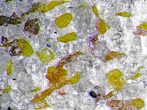 Fluocerit-(Ce), gelbe Körner Detail der links abgebildeten Stufe Bildbreite: 5 mm |