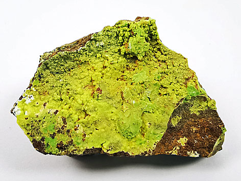 trigonales Kristallsystem; hellgrün, gelbgrün bis olivgrün; meist als traubig-nierige bis massige oder erdig matte Aggregate oder als Krusten; selten kleine, rhomboedrische Kristalle bis etwa 0,6 mm Länge mit einem glasähnlichen Glanz auf den Oberflächen. |