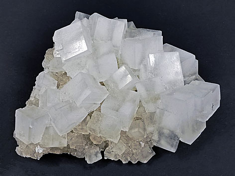 kubisches Kristallsystem; farblos, weiß, hell- bis dunkelblau, rosa; meist würfelförmige Kristalle, seltener Hexaeder, Rhombendodekaeder, Oktaeder oder Tetrakishexaeder, ebenso großflächige, körnige bis massige, selten auch faserige Aggregate. |