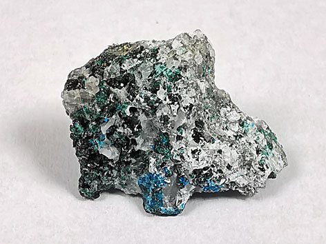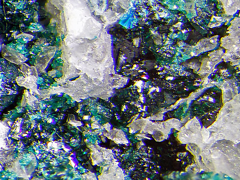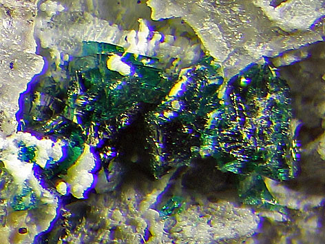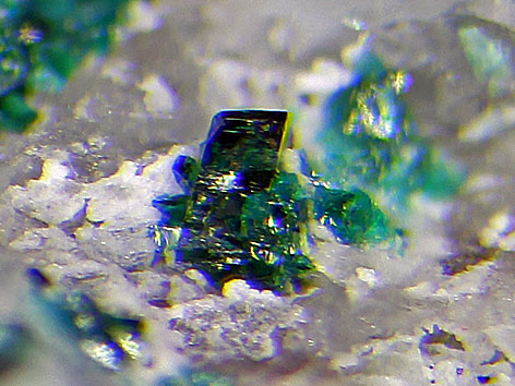 Lammerit xx (dunkelgrün) neben Lavendulan (blau), Quarz u. a El Guanaco Mine, Santa Catalina, Provinz Antofagasta, Region (II. Region) Antofagasta, Chile Stufe: 2,0 x 1,5 cm