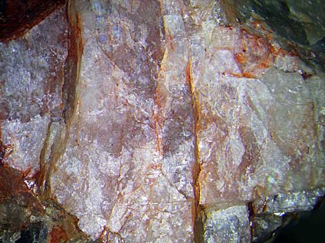 weiße bis rosafarbene Lanthanit-(La) Kristall-Spaltflächen Bastnäs, Riddarhyttan, Skinnskatteberg, Schweden (TL) Bildbreite: 18 mm