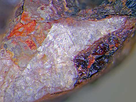 ![]() tiefroter Cerit-(Ce) in einem rosafarbenen Lanthanit-(La)-Kristall Bastnäs, Riddarhyttan, Skinnskatteberg, Schweden (TL)