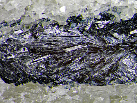 monoklines Kristallsystem; blau, dunkelgrün, schwarz; asbestförmige Fasern, prismatische Kristalle und körnige Aggregate |
