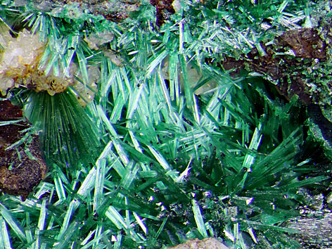 monoklines Kristallsystem; grün; typischerweise prismatische, nadelige bis faserige Kristalle, manchmal radialstrahlige Aggregate, auch massiv, erdig, körnig, nierenförmig oder stalaktitenartig. |