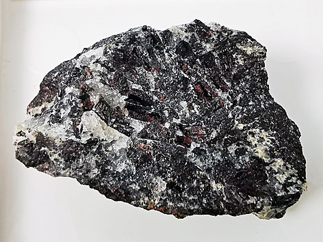 monoklines Kristallsystem; rötlichschwarz; kristalline Spaltaggregate in Matrix und kleine prismatische Kristalle. |