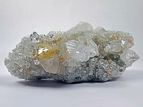gelbliches Powellit-Kristall neben Stilbit-Ca xx auf Fluorapophyllit-(K) xx Jalgaon Distrikt, Maharashtra, Indien Stufe: 12,0 x 5,5 cm