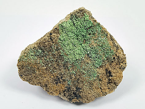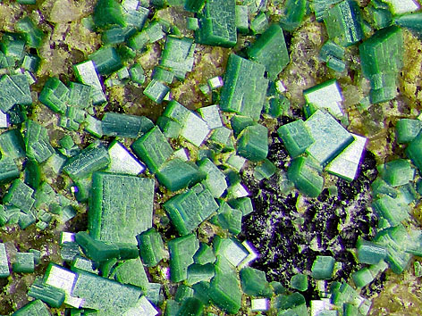 tetragonales Kristallsystem; grasgrün, smaragdgrün; Kristalle meist dünntafelig bis tafelig, seltener dipyramidal u. a., auch schuppig oder pulverig. |