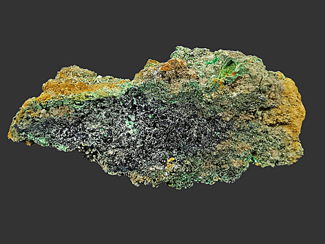 Spionkopit als Erzeinschlüsse mit Yarrowit in Bornit und Djurleit neben Malachit Helbraer Schlotte (Strecke am Querschlag Nähe Schacht E), Helbra, Sachsen-Anhalt, BRD Stufe: 2,7 x 1,2 cm