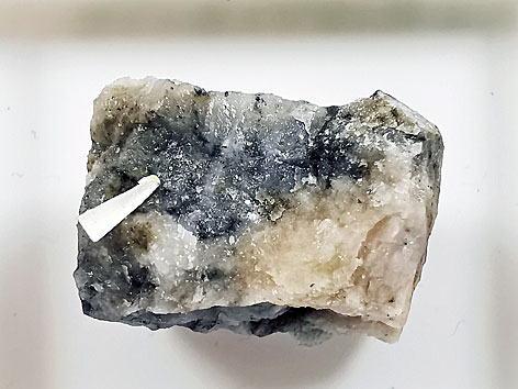 Aurostibit, silberweiß (im Zentrum des Fotos), neben Quarz u. a.
