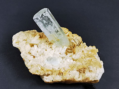 Aquamarin-Kristall neben Muskovit auf Albit Stak Nala, Nanga Parbat-Haramosh-Berge, Skardu, Gilgit-Baltistan, Pakistan Stufe: 7,5 x 4,7 cm