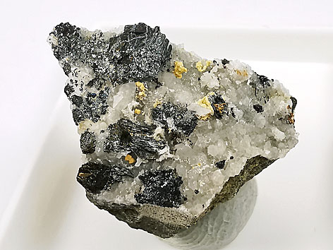 Betechtinit xx neben Quarz, Chalkopyrit u. a. auf Matrix Steinbruch am Emmertsberg, Waschenbach, Mühltal, Darmstadt-Dieburg, Hessen, BRD Stufe: 2,2 x 1,3 cm