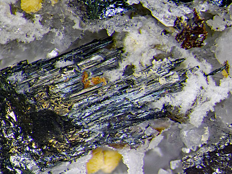 orthorhombisches Kristallsystem; graubraun bis eisenschwarz metallisch, oft braun angelaufen; Metallglanz; nadelförmige bis stengelige xx oft mit Riefung parallel der Längsachse bis 2 cm Länge, auch in Form unregelmäßiger Massen. |