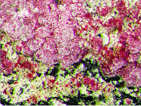 monoklines Kristallsystem; blass rosarot bis fleischrot; nur winzige Kristalle; meist findet er sich in Form von Stalaktiten oder krustiger Überzüge. |