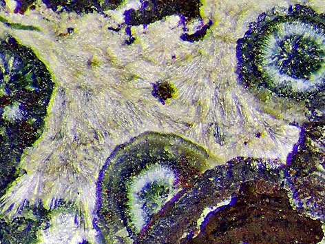 monoklines Kristallsystem; cremefarben, weiß bis gelb; kleine Kristalle, nadelig bzw. als abgeflachte Fasern (dünne Latten), meist als strahlige, radiale Aggregate. |