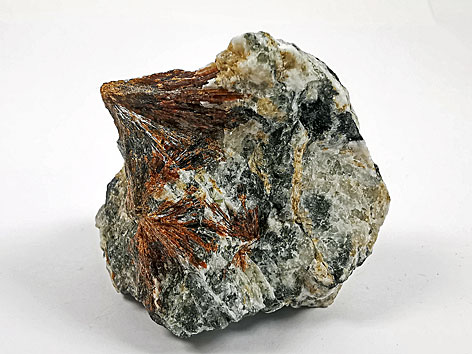 monoklines Kristallsystem; gelb, orange bis orangebraun; nadelige bis langtafelige Kristalle zu oft strahligen Aggregaten. |
