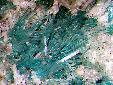 monoklines Kristallsystem; himmelblau, grünlichblau; gestreckte, tafelige, nadelige, oft gestreifte Kristalle, oft zu radialstrahligen Aggregaten, auch faserige, krustige oder derbe Aggregate. |