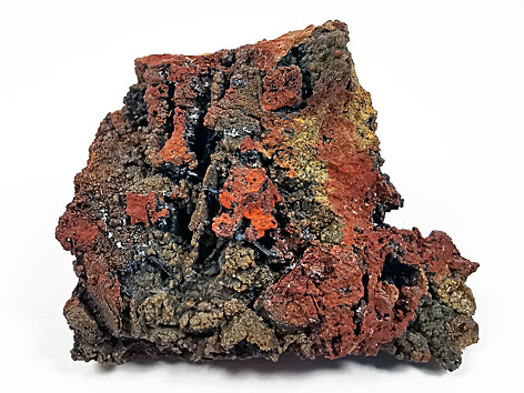monoklines Kristallsystem; grau mit roten internen Reflexionen; Metallglanz; meist als kleine, körnige Aggregate, selten als klingenförmige Kristalle. |