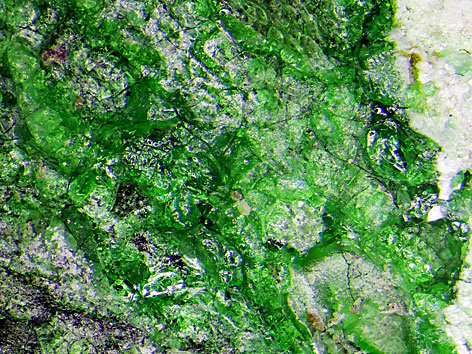Zaratit als grüne, durchsichtige Kruste bzw. Aggregate Detail der links abgebildeten Stufe Bildbreite: 5 mm